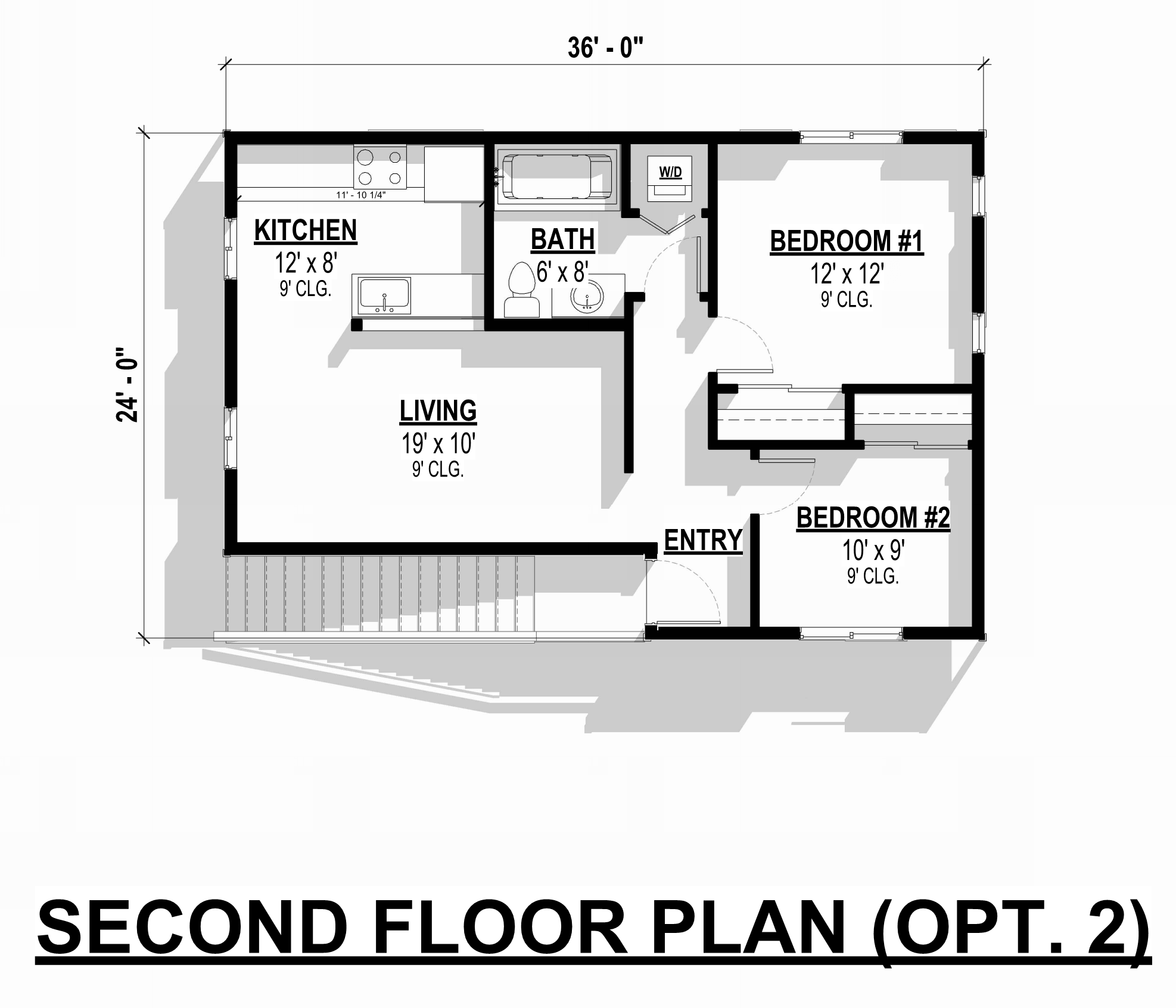 Head up the protected staircase to find a thoughtfully designed living space to reach the second floor. The open floor plan offers two layout options, depending on whether you prefer one or two bedrooms. The living room, dining area, and kitchen are arranged in such a way as to maximize functionality and create a comfortable, welcoming atmosphere. With its practical yet stylish design, this ADU can enhance the property’s utility and suit various living arrangements, making it an excellent choice for anyone looking for a flexible and practical home design solution.