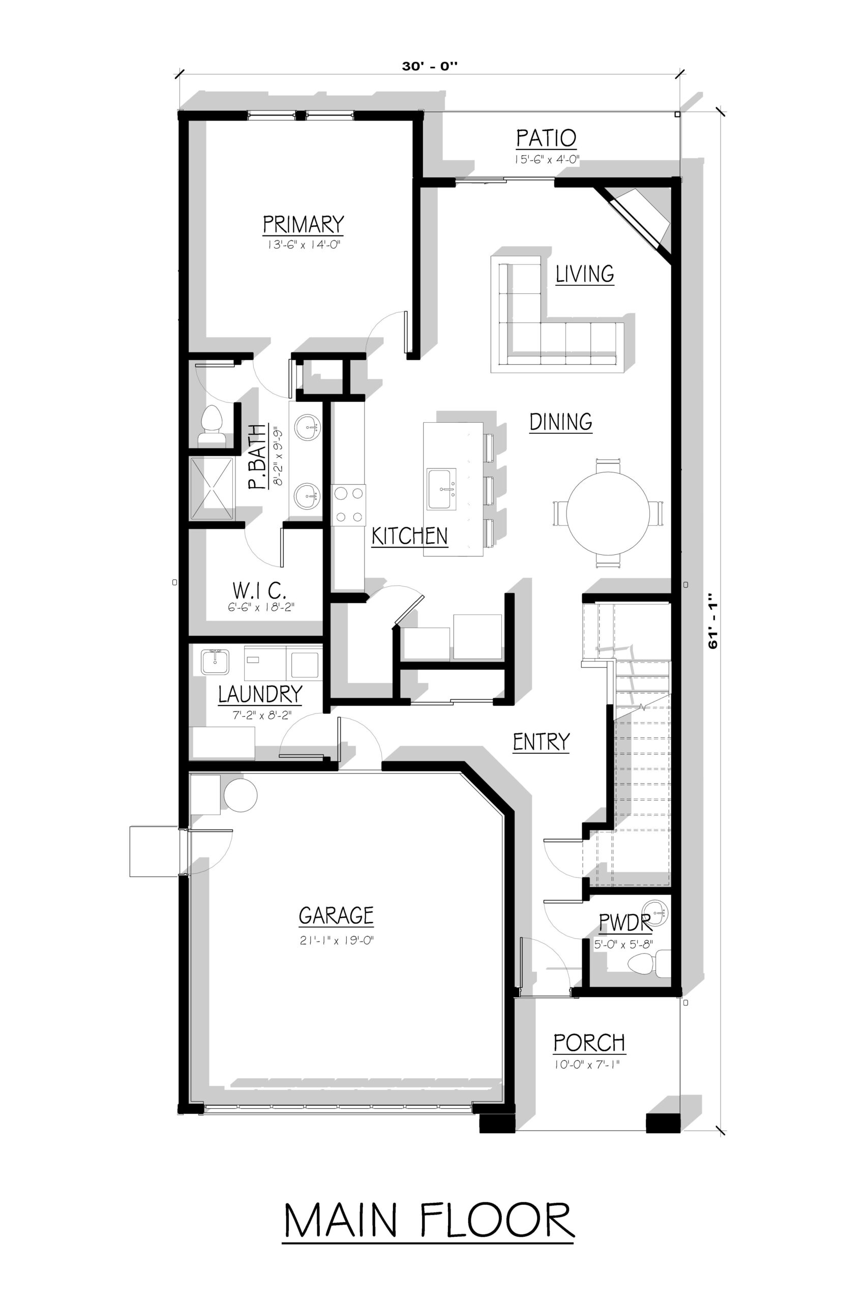 With a footprint of 30′ x 61′ and an overall building height of 24’ 6″, this home is thoughtfully designed to maximize space and style on a narrow lot.