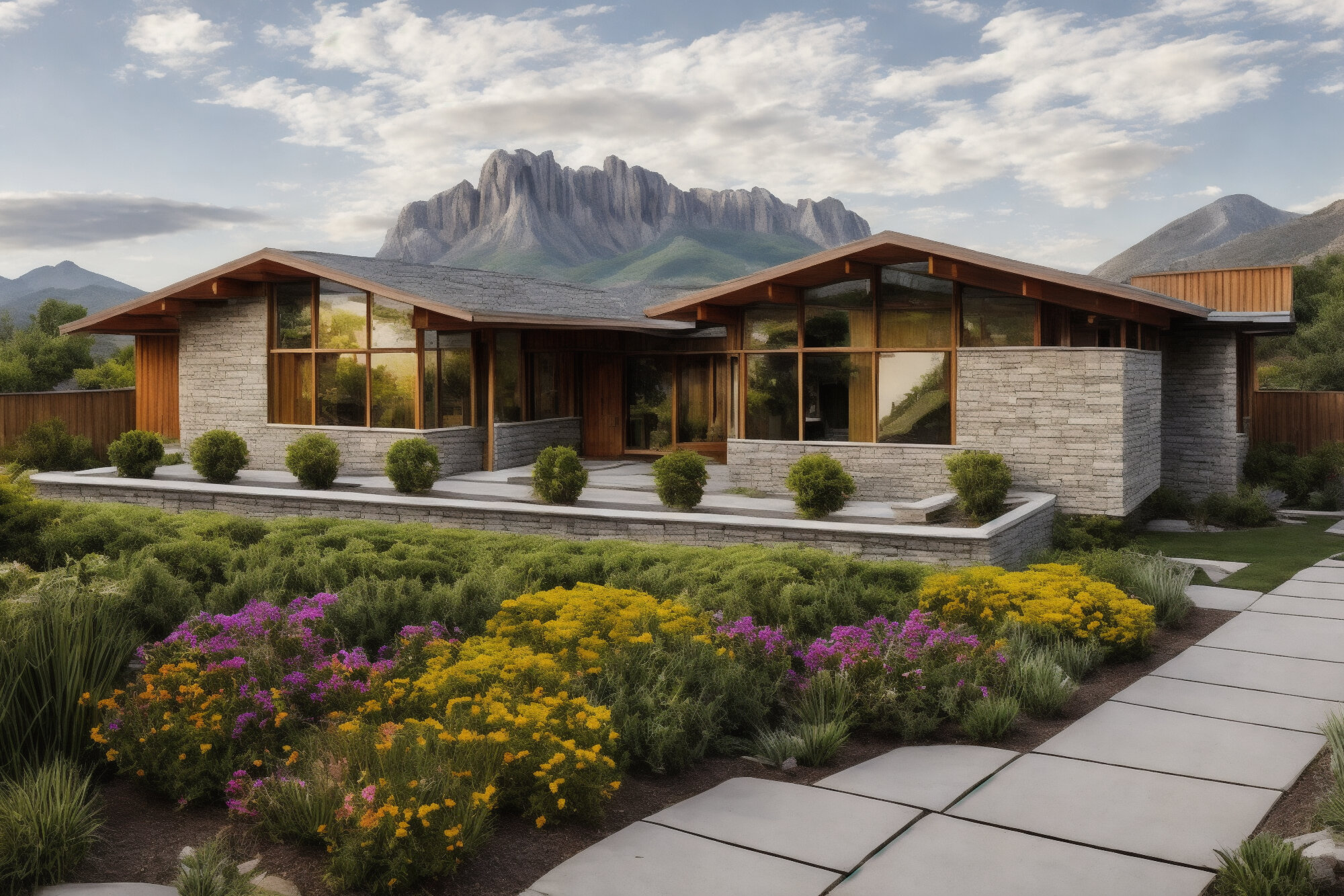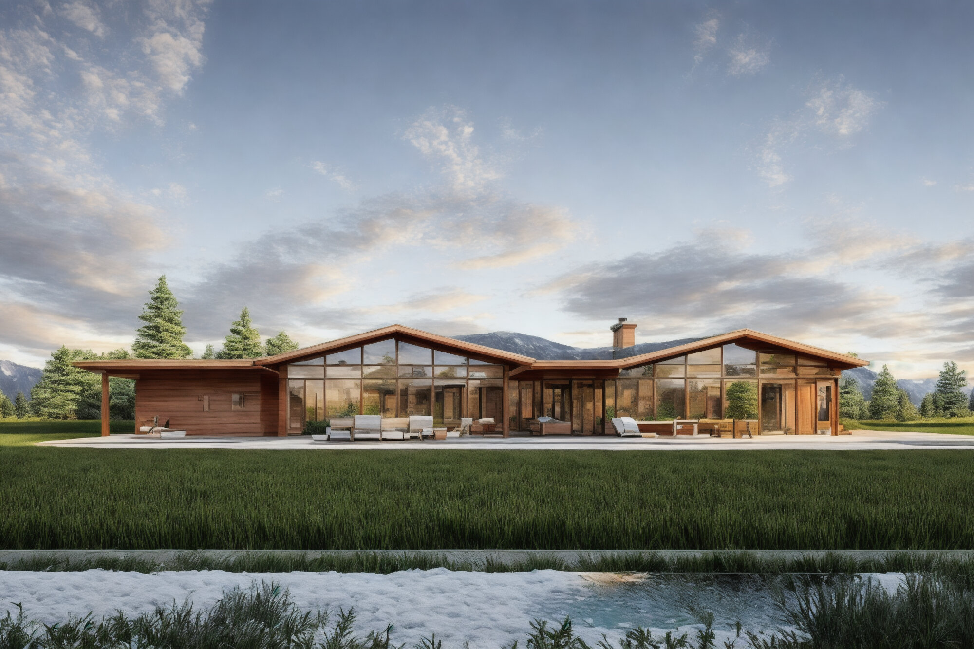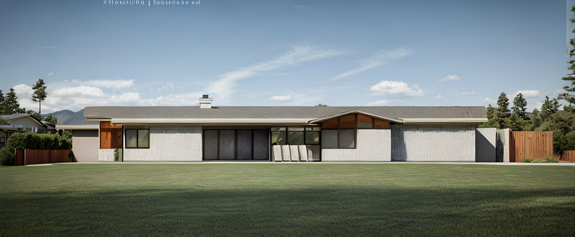 Experience the timeless elegance of a 4-Bed Mid-Century Modern House Plan, stunning single-level home. With 2,868 sq. ft. of living space, this home features an open floor plan, large windows, and glass doors that create a seamless transition between indoor and outdoor spaces. Natural wood and stone accents adorn the exterior, while exposed framing on the interior ceilings adds character and uniqueness to the living spaces. The peaceful entry courtyard offers a tranquil transition to the indoors.