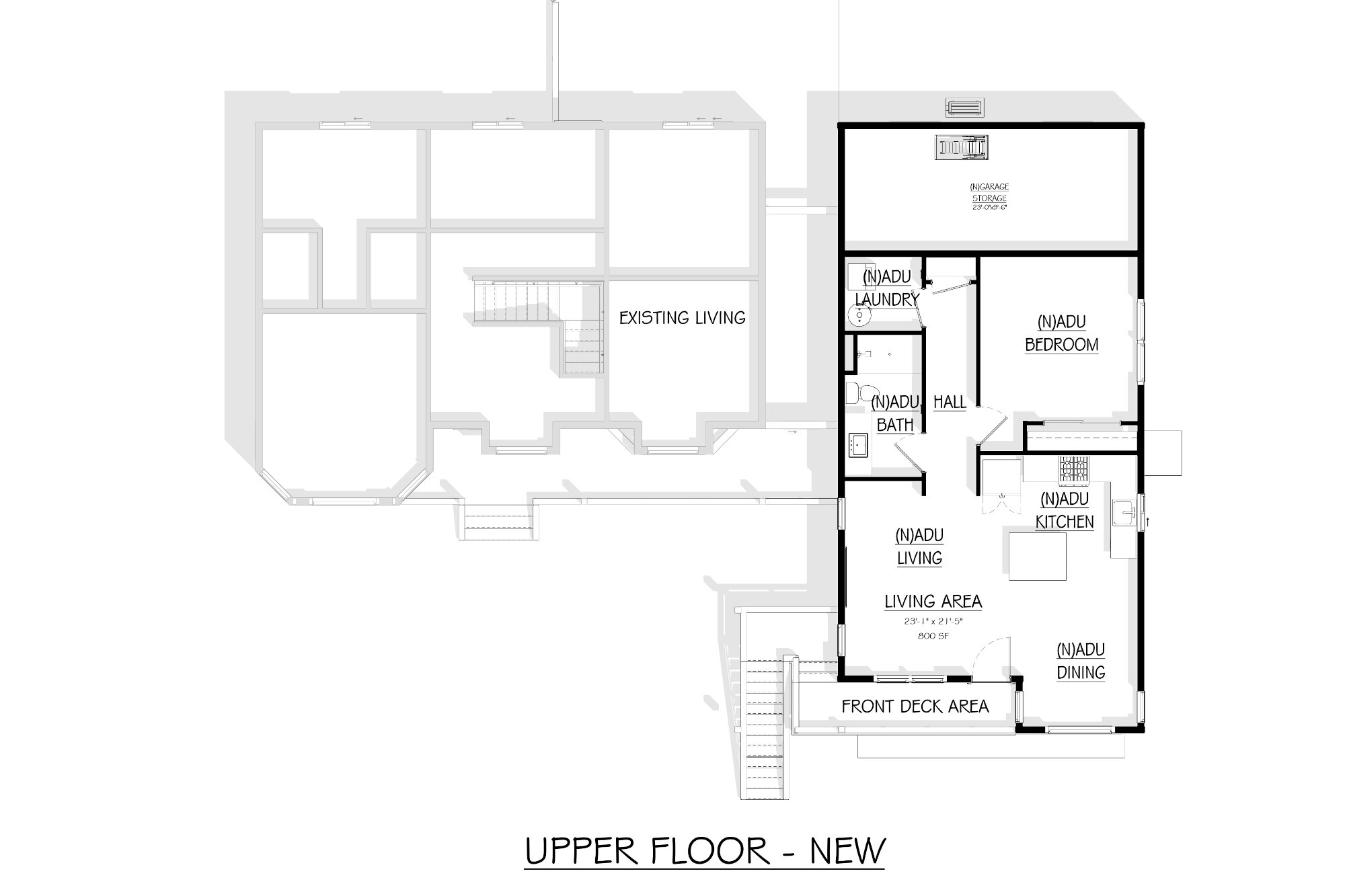 A new garage and a second-story Accessory Dwelling Unit (ADU) addition. The project involved designing and constructing 800 square feet of new space, seamlessly integrated with 2,300 square feet of existing home. As part of the transformation, two existing garage bays were converted into two tandem garage bays to optimize space utilization. Our scope of work encompassed building plans, site plans, engineering, structural drafting, and navigating the complexities of building permit representation.