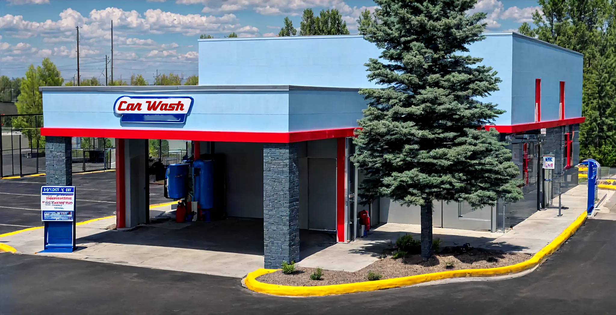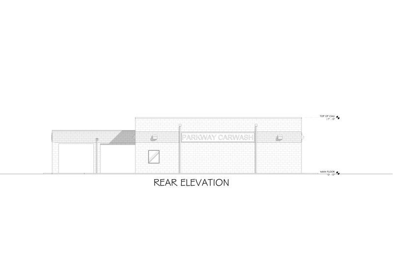 The drive-thru Bay Area features a spacious layout, allowing vehicles to navigate easily through the cleaning process. Large openings in the CMU walls accommodate the entrance and exit points for vehicles.