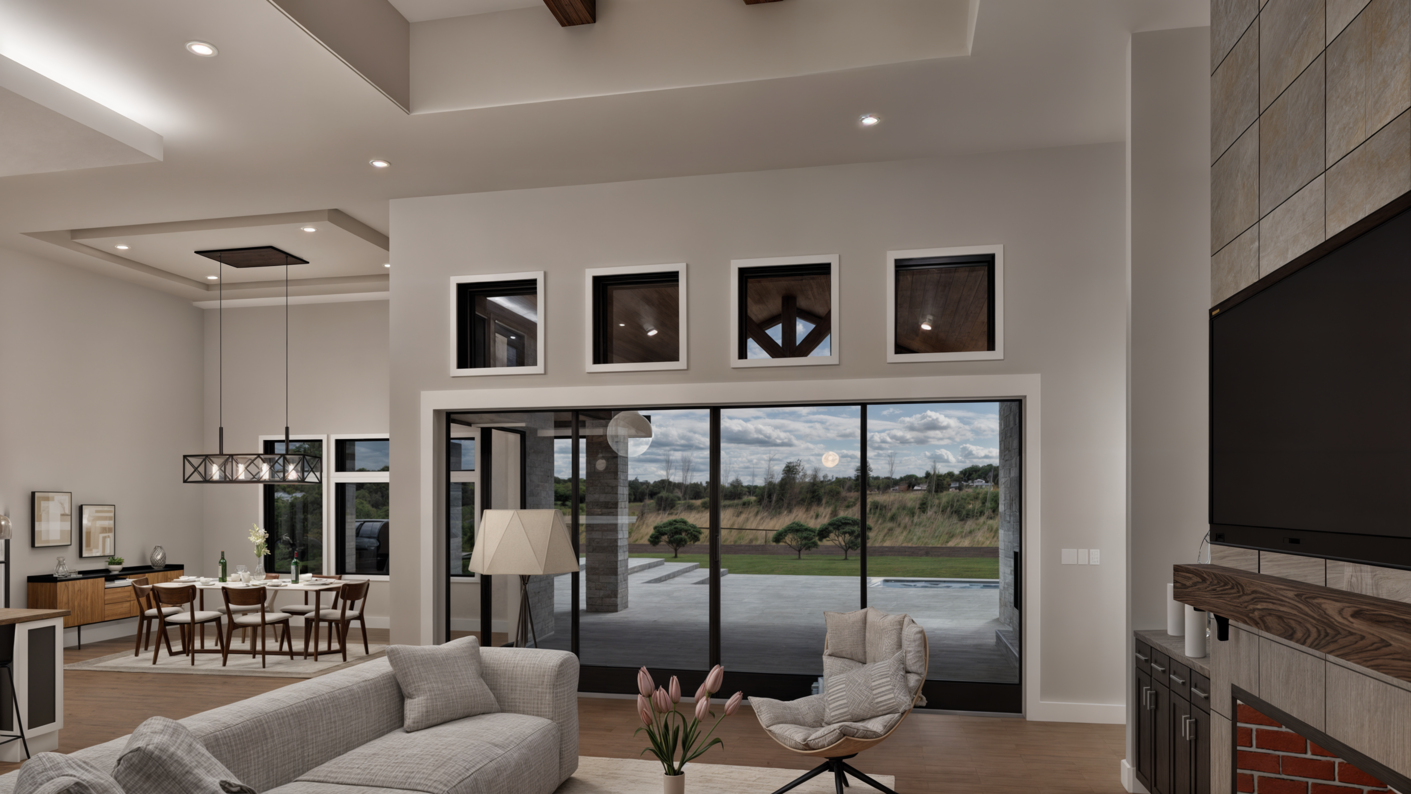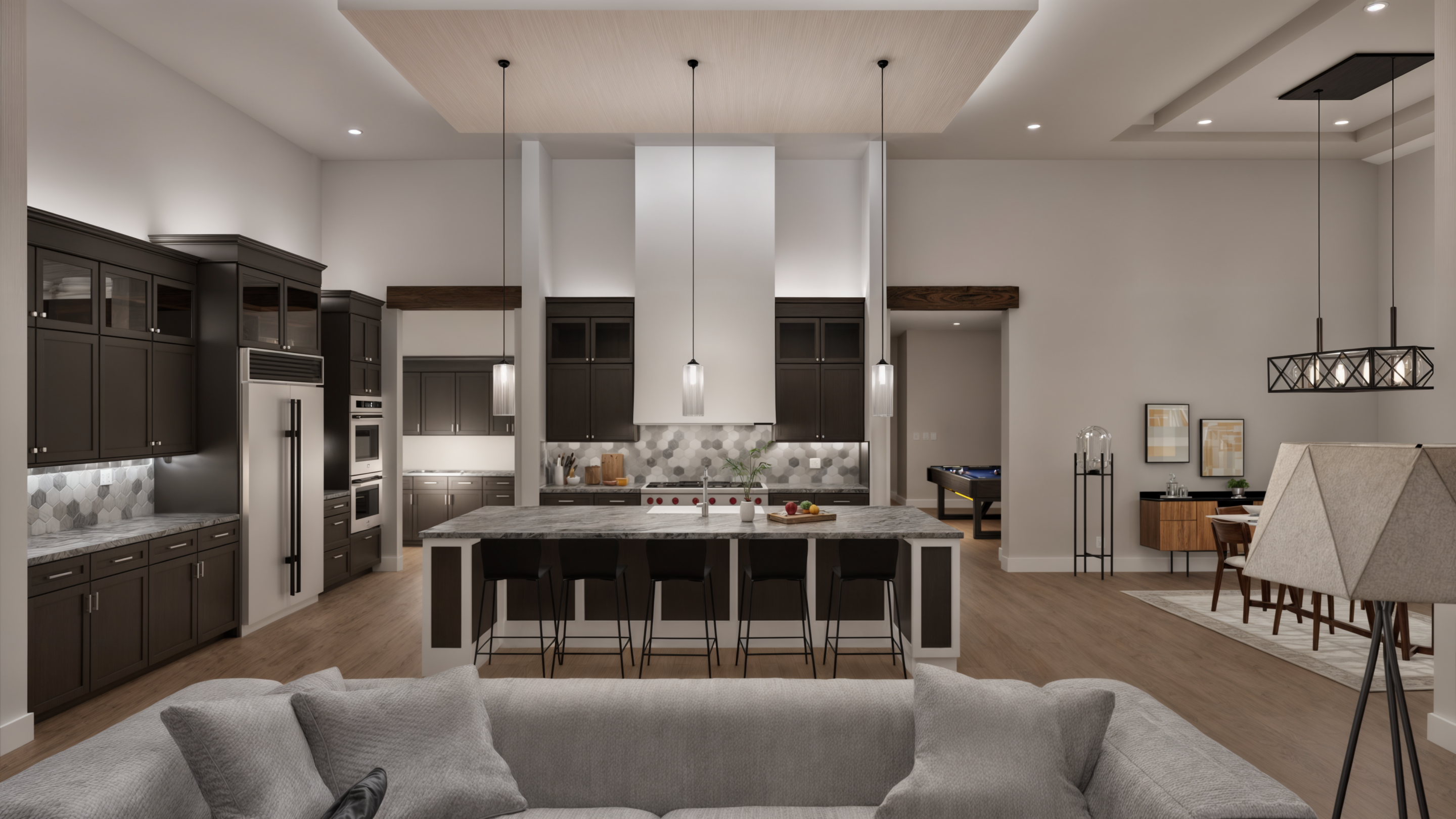 This luxurious one-story residence is a masterpiece of modern architecture, spanning over 4,776 square feet of living space. The property is serene, providing a haven for relaxation and entertainment. The home features a grand foyer that leads to an open-concept living area, where fluidity between spaces is paramount. The heart of the home boasts a gourmet kitchen equipped with state-of-the-art appliances, a generous island, and ample storage. The kitchen area flows effortlessly into the expansive living and dining areas, adorned with panoramic views of the lush surroundings.