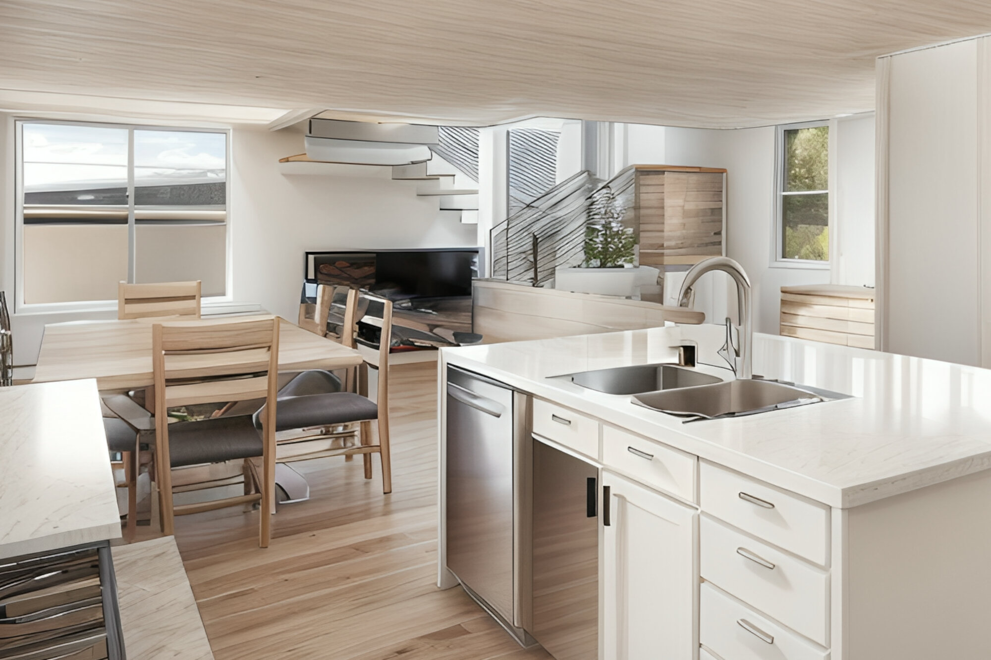 On the first floor, discover a well-appointed kitchen with a central island and a walk-in pantry, complemented by a spacious dining area and essential utility rooms. The second floor provides expansive living areas with two spacious bedrooms and two modern bathrooms, creating a private retreat for each resident. The third floor offers versatility with additional living space, ideal for home offices, recreational areas, or guest accommodations. In the rear unit, a dramatic catwalk overlooks large windows, creating a striking architectural feature.