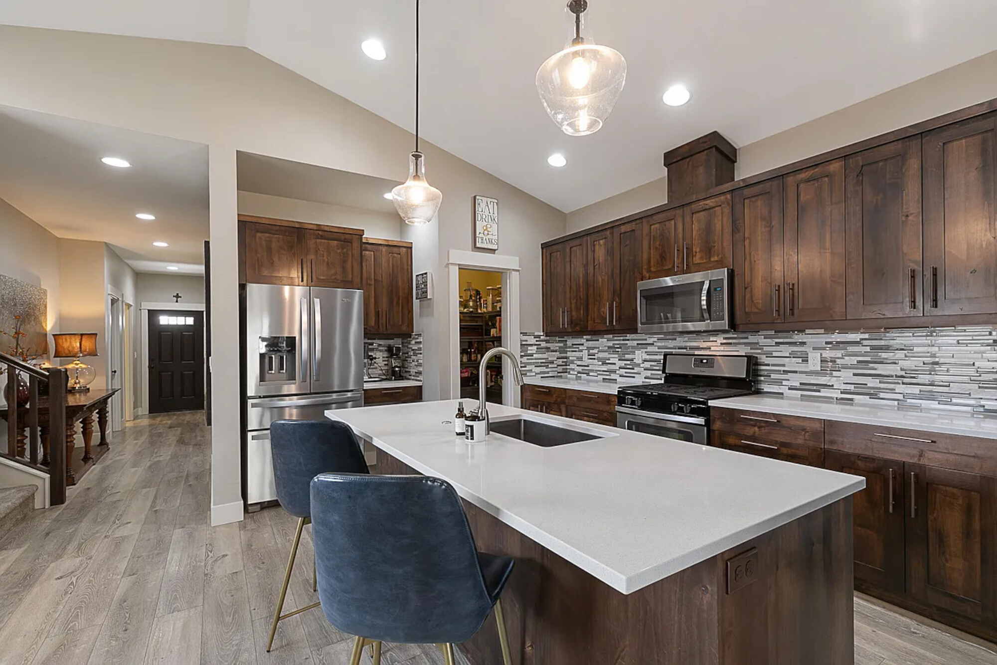 Northwest-style Home Designed for a Narrow Lot is two-story, three-bedrooms and perfectly blends rustic charm and modern convenience. Its main floor primary bedroom ensures easy accessibility and privacy for the homeowners. The exterior boasts characteristic elements like exposed wooden beams and stone accents, echoing the natural beauty of the surrounding landscape. Inside, an open-concept living area with a cozy fireplace invites gatherings, while large windows provide ample natural light and stunning views of the lush greenery outside. Upstairs, two additional bedrooms offer comfortable living spaces, making this 2,016-square-foot house a perfect retreat for those seeking style and functionality in the heart of the Pacific Northwest.