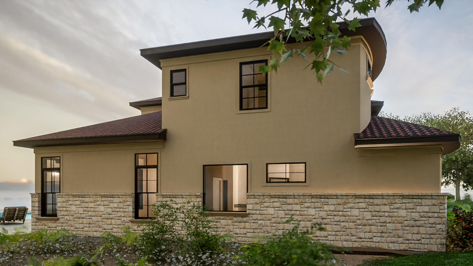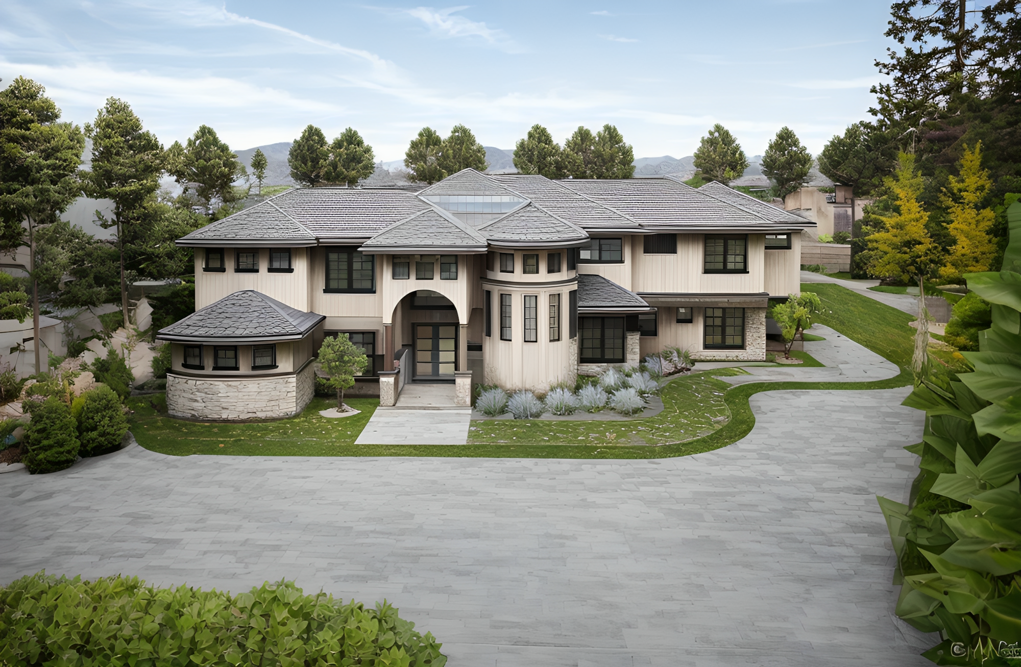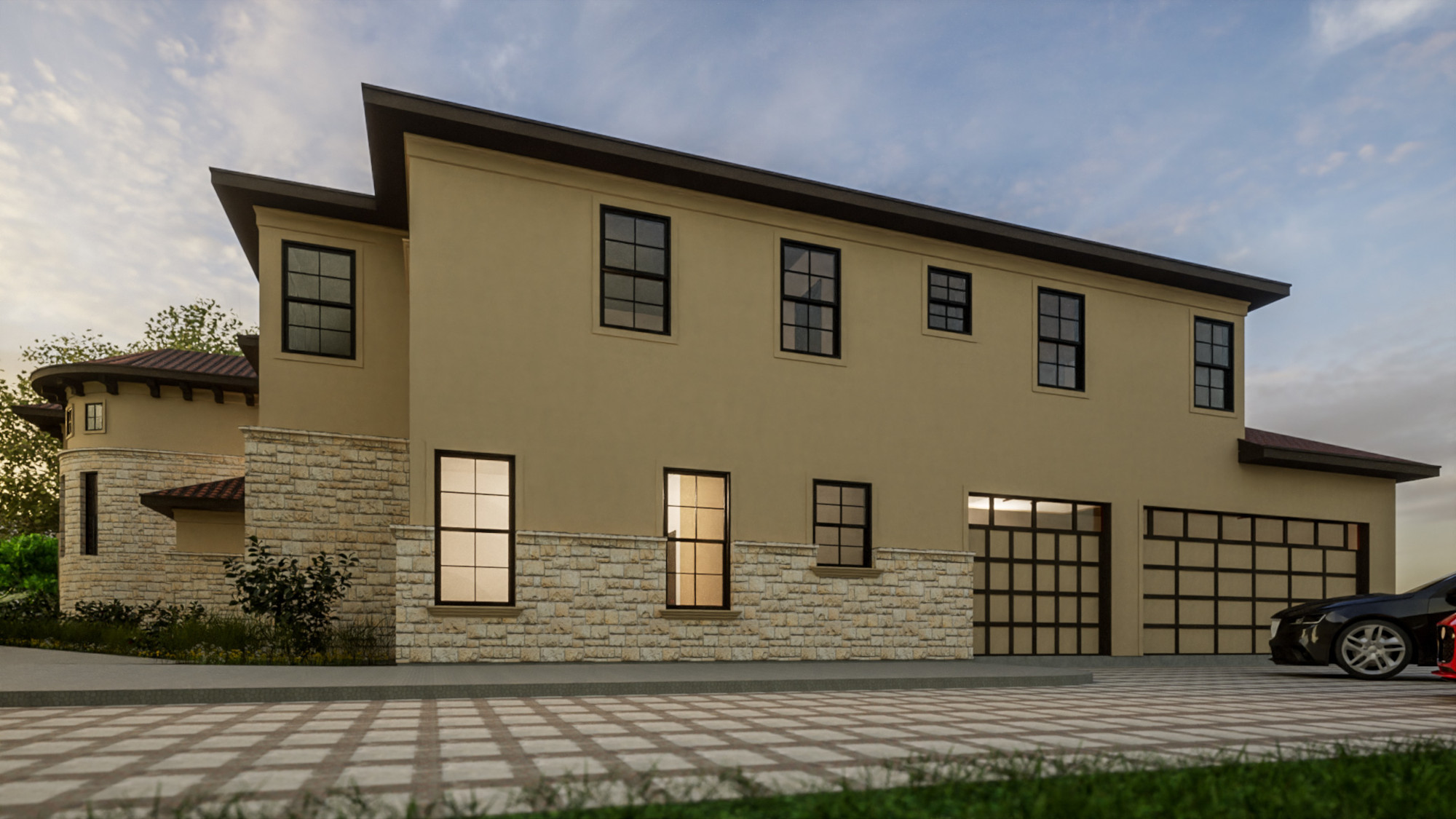 This stunning two-story Rustic Mediterranean Home Plan, designed by Radius Design, seamlessly blends rustic charm with modern luxury. It features a detached garage with an accessory dwelling, five bedrooms with en-suite bathrooms, and a covered outdoor entertaining area with a fireplace. The interior has an open-concept living space connecting the kitchen, dining, and living areas. The gourmet kitchen has custom cabinetry, a large island with a farmhouse sink, and high-quality appliances. Each bedroom has its own en-suite bathroom, with the master suite offering a spa-like experience. This is the perfect epitome of refined country living, providing a warm and inviting retreat.